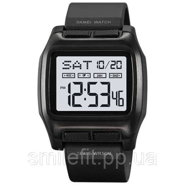 Корпус годинника виконаний у графітово-чорному кольорі з плавними обводами, які надають моделі динамічного вигляду. Контрастний світлий екран чітко відображає час, дату, день тижня і статус активних функцій. Стильна квадратна форма корпусу доповнена надійним ремінцем із м’якого силікону, що забезпечує комфортне носіння протягом усього дня.