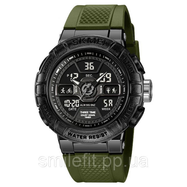 SKMEI 2227AG — це сучасний спортивний годинник із брутальним дизайном, який ідеально поєднує стиль та функціональність. Його агресивний зовнішній вигляд з масивним корпусом та оливковим ремінцем одразу привертає увагу. Великий циферблат з графічними і цифровими елементами дозволяє легко орієнтуватися у функціях навіть під час інтенсивного тренування або подорожі.