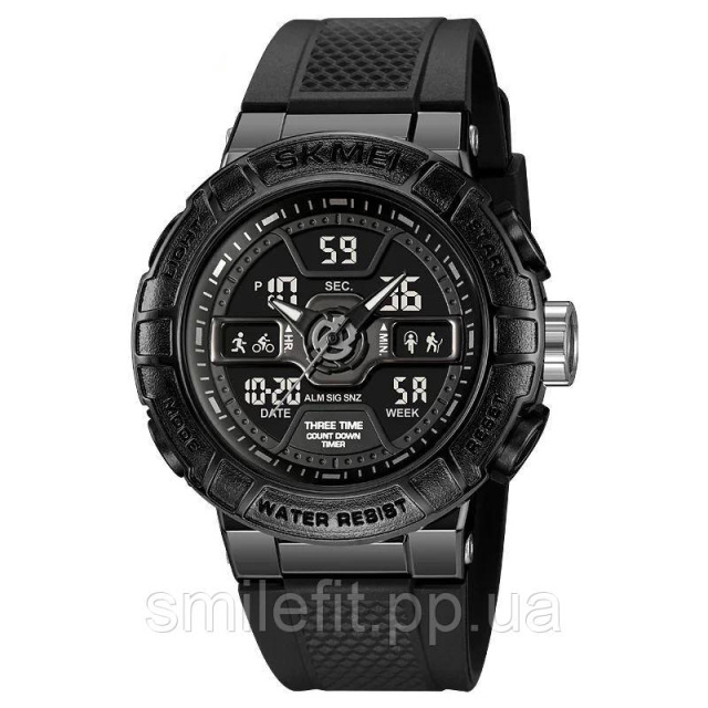SKMEI 2227BK — це брутальний чоловічий годинник у повністю чорному виконанні, який виглядає стильно, технологічно та підкреслює силу характеру власника. Його потужний корпус, рельєфний безель і масивні кнопки створюють враження професійного інструмента для екстремальних умов. Аналогова індикація вдало поєднується з багатофункціональним цифровим дисплеєм, що дозволяє користуватись усіма функціями швидко та інтуїтивно.