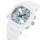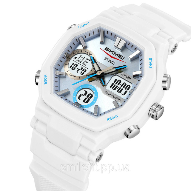 Головна особливість моделі — свіжий білий дизайн із сріблясто-блакитним циферблатом, який виглядає яскраво та сучасно. Масивний корпус, зручне розташування кнопок і підсвітка дисплеїв забезпечують максимальну зручність у використанні. Годинник привертає увагу не тільки кольором, але й вдалим поєднанням аналогових і цифрових елементів.