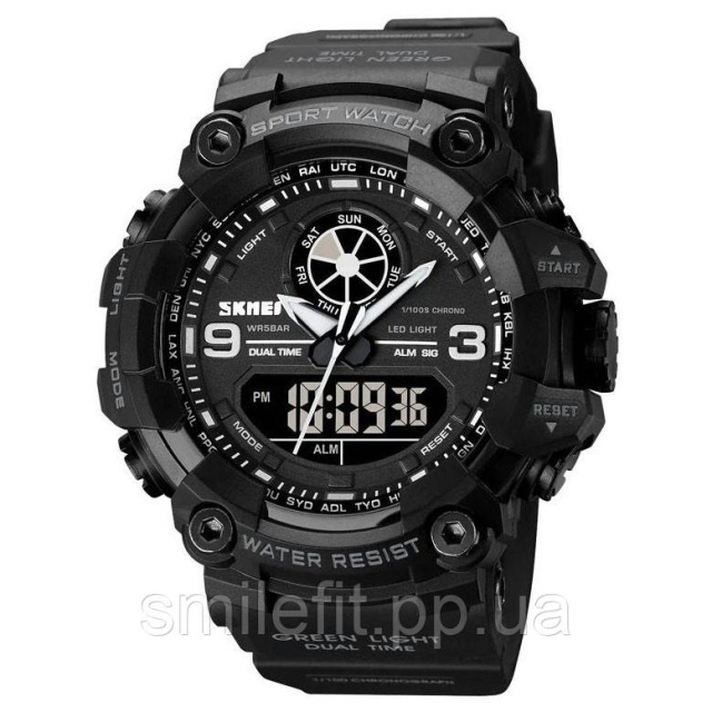 Годинник SKMEI 1818BK — це ідеальне поєднання агресивного спортивного дизайну та багатофункціонального наповнення. Масивний корпус з чорного пластику та міцний поліуретановий ремінець створюють надійне враження з першого погляду. Аналогово-цифрова індикація дозволяє швидко зчитувати час і користуватись додатковими функціями незалежно від освітлення — завдяки LED-підсвітці дисплея.