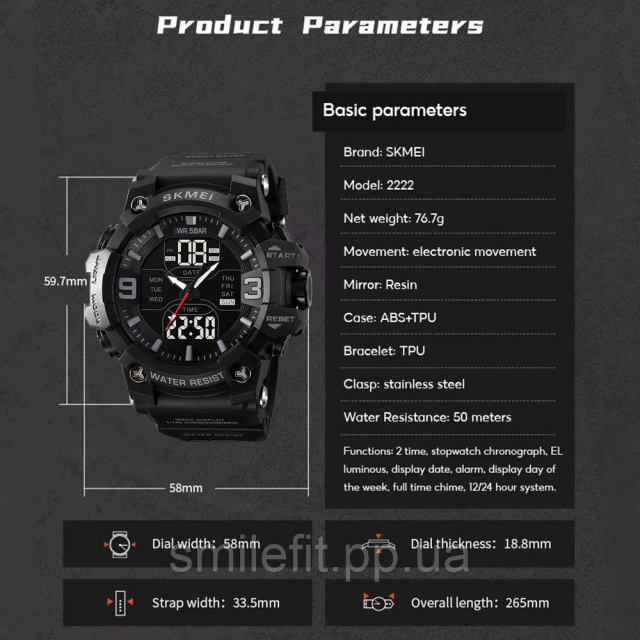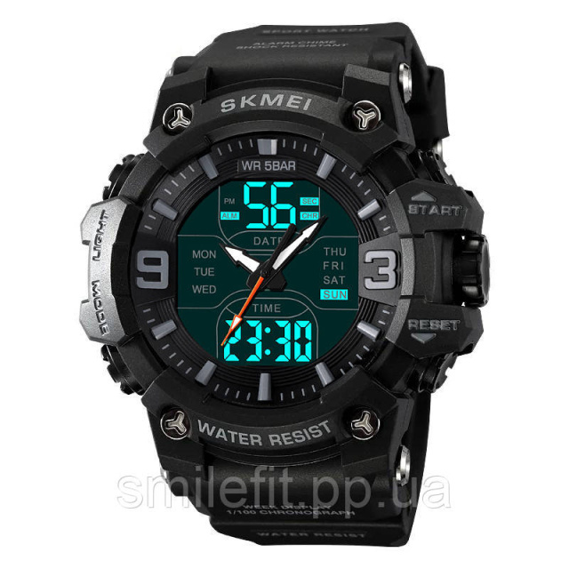 Модель оснащена усім необхідним для повсякденного застосування — подвійний час, дата, день тижня, секундомір, будильник, підсвітка та формат 12/24 год. Водозахист 5 ATM дозволяє не знімати годинник під час дощу, миття рук або навіть плавання. SKMEI 2222BK стане вашим надійним супутником у будь-яких умовах — від спортзалу до подорожей і пригод на природі.