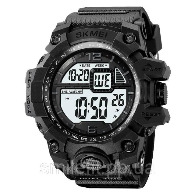 SKMEI 2245BKWT поєднує стиль і функціональність: він обладнаний таймером, секундоміром, світовим часом, декількома будильниками, функцією сну та іншими корисними режимами. Високий рівень водозахисту дозволяє не знімати годинник під час дощу чи занять спортом. Це ідеальний варіант для туризму, тренувань і повсякденного носіння.