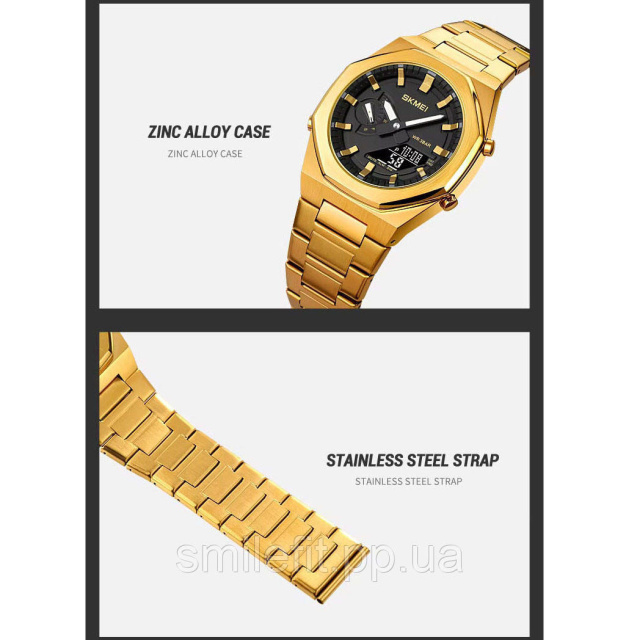 SKMEI 1816GDBK — це втілення преміального стилю в доступному сегменті. Модель вирізняється повністю золотим металевим корпусом та браслетом, що надає їй елегантного вигляду. Цей годинник поєднує аналогову індикацію з цифровим дисплеєм, що забезпечує не лише точність, а й зручність у користуванні. Його геометричний корпус із скошеними гранями та контрастним чорним циферблатом виглядає сучасно й дорого.