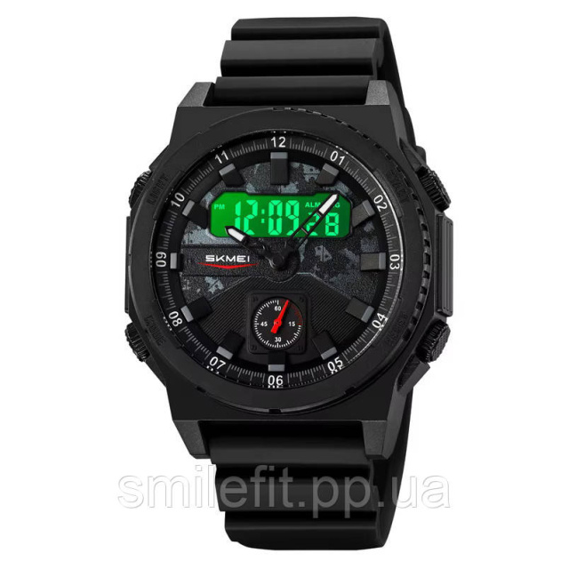SKMEI 2355BK — це чоловічий годинник у стилі мілітарі, створений для тих, хто цінує практичність, сучасний вигляд і надійність. Глибокий чорний колір корпусу та ремінця підкреслює строгість стилю, а камуфльований фон циферблата надає характеру. Ця модель поєднує в собі стрілочну класику та зручний цифровий дисплей з яскравою зеленою підсвіткою, що дозволяє комфортно використовувати годинник у темряві.