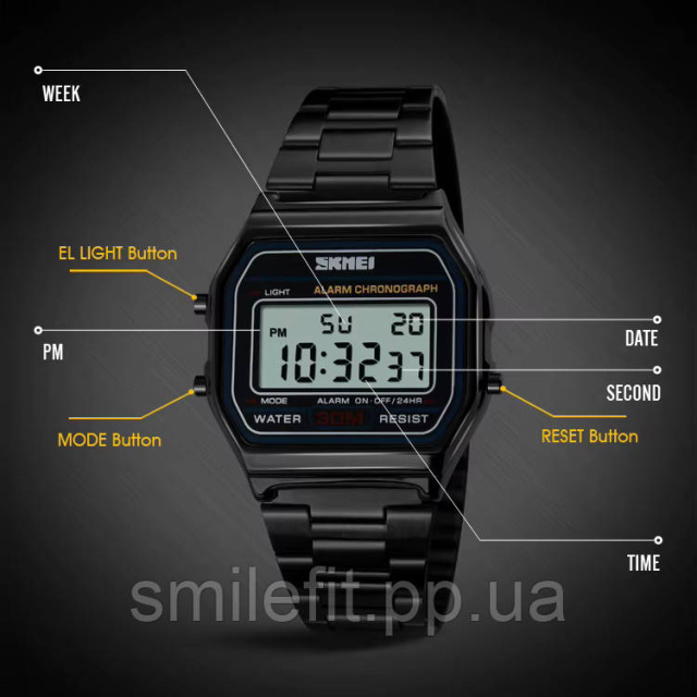 Модель має базовий, але повністю достатній набір функцій: поточний час, дата, будильник, секундомір та підсвітка. Водозахист 30M дозволяє не знімати годинник при митті рук або під час дощу. SKMEI 1123BK — ідеальний вибір для тих, хто шукає недорогий, перевірений часом аксесуар у вінтажному стилі.
