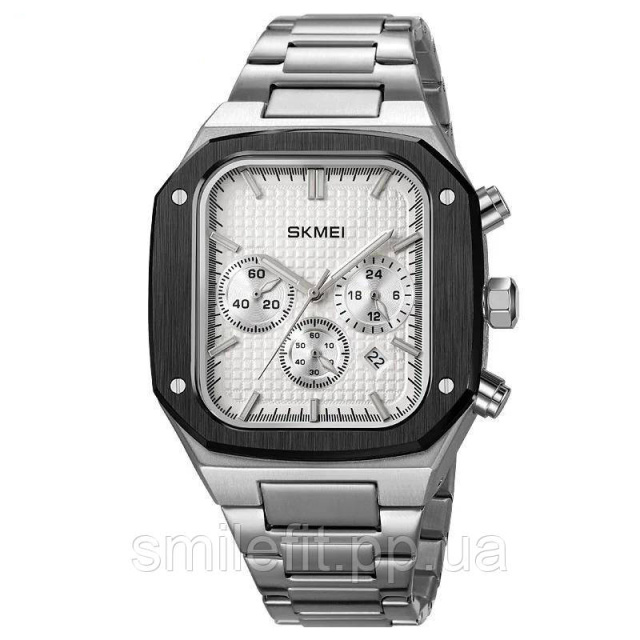 SKMEI 2201SI — це вишуканий чоловічий годинник у сріблястому кольорі з елегантним білим циферблатом, створений для тих, хто цінує класичну естетику в сучасному виконанні. Прямокутний корпус із чіткими гранями, сталевий браслет та контрастна чорна рамка навколо циферблата надають моделі виразного й статусного вигляду. Рельєфна текстура фону та сріблясті міні-циферблати додають глибини дизайну та підкреслюють увагу до деталей.