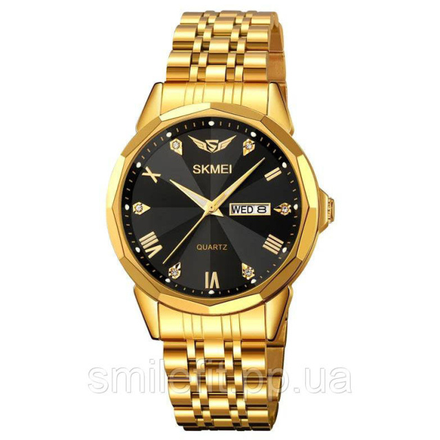 Годинник SKMEI 2291GDBK — це втілення розкоші та елегантності в кожній деталі. Його глянцевий золотий корпус і браслет в поєднанні з чорним циферблатом створюють вражаючий контраст, що підкреслює статус і вишуканий смак власника. Римські цифри та декоративні камені на мітках додають класичного шарму, а віконце дати та дня тижня забезпечує зручність у повсякденному використанні.