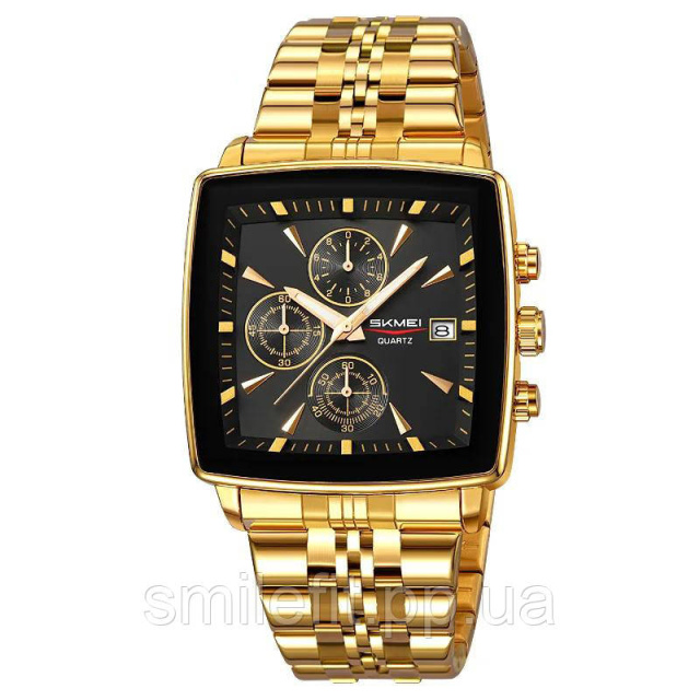 Годинник SKMEI 2434GD — це втілення розкоші та статусного стилю в кожній деталі. Його квадратний корпус у золотому кольорі в поєднанні з масивним браслетом виглядає яскраво й дорого, привертаючи увагу з першого погляду. Чорний циферблат контрастно підкреслює золоті стрілки, індекси та три допоміжні міні-циферблати, що створює ефектний акцент у дизайні. Віконце дати додає зручності у щоденному використанні.