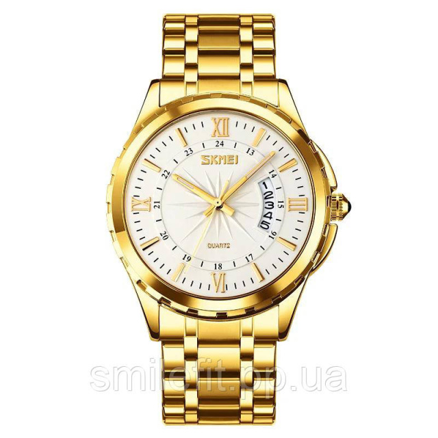 SKMEI 9069GDWT — це елегантний наручний годинник, який ідеально доповнить образ успішної та стильної людини. Його глянцевий корпус і браслет золотого кольору створюють розкішне враження, а білий циферблат з римськими індексами додає класичної вишуканості. Це ідеальний аксесуар як для ділових зустрічей, так і для особливих подій.