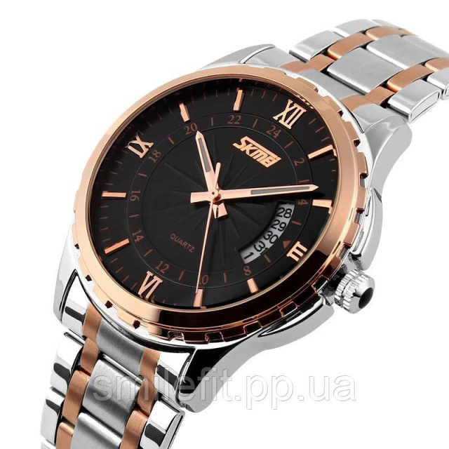 SKMEI 9069TRGBK — це стильний кварцовий годинник для чоловіків, які цінують вишуканість у деталях. Поєднання класичного чорного циферблата з римськими індексами та металевого браслета з золотистими вставками створює ефектний, але водночас стриманий образ. Такий аксесуар чудово доповнює як діловий костюм, так і повсякденний лук.