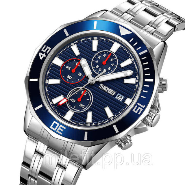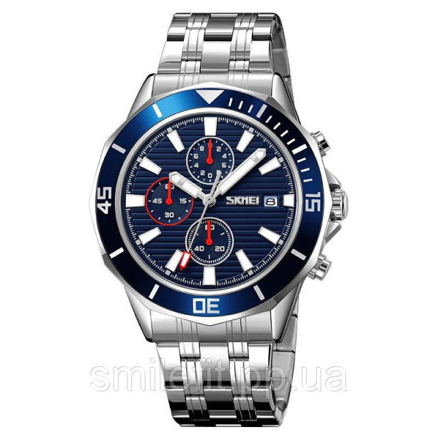 SKMEI 9335SIBU — це стильний чоловічий годинник, який вдало поєднує сучасний дизайн та функціональність. Його корпус і браслет із нержавіючої сталі створюють солідний вигляд, а насичений синій циферблат із контрастними хронографами додає динаміки та спортивної елегантності. Цей аксесуар чудово доповнить як діловий костюм, так і повсякденний образ.