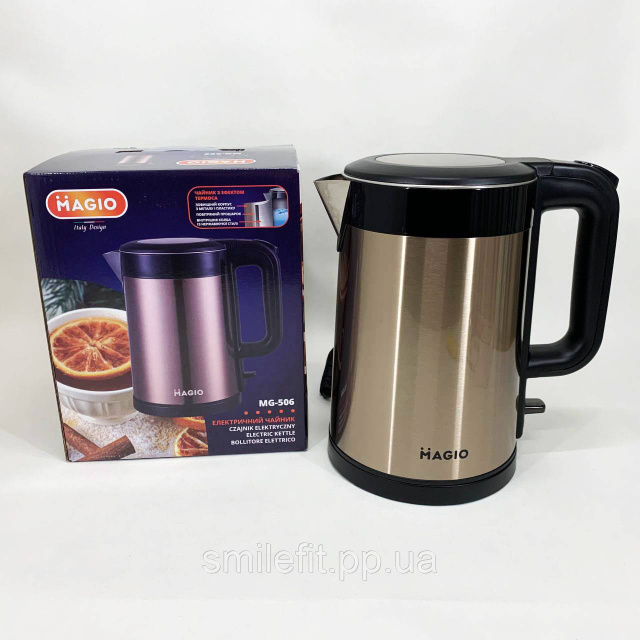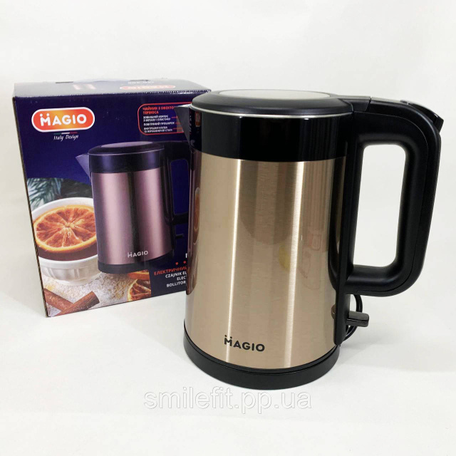 Електрочайник Magio МG-506 поєднує в собі функціональність та стильний дизайн. Об’єм 1,5 літра та потужність 1500 Вт забезпечують швидкий закип води, а двошаровий корпус із захистом від опіків підвищує безпеку використання.