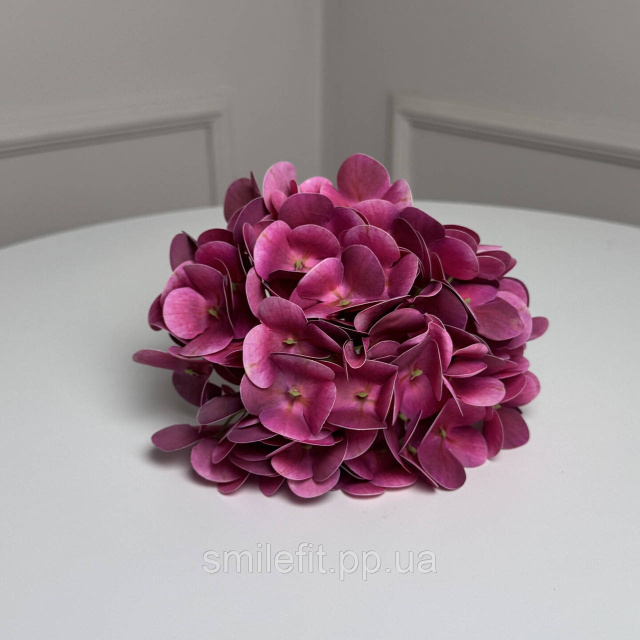 Штучна латексна гортензія у кольорі фуксія виглядає яскраво та ефектно завдяки щільному кулястому суцвіттю й насиченій кольоровій гамі. Багатошарові