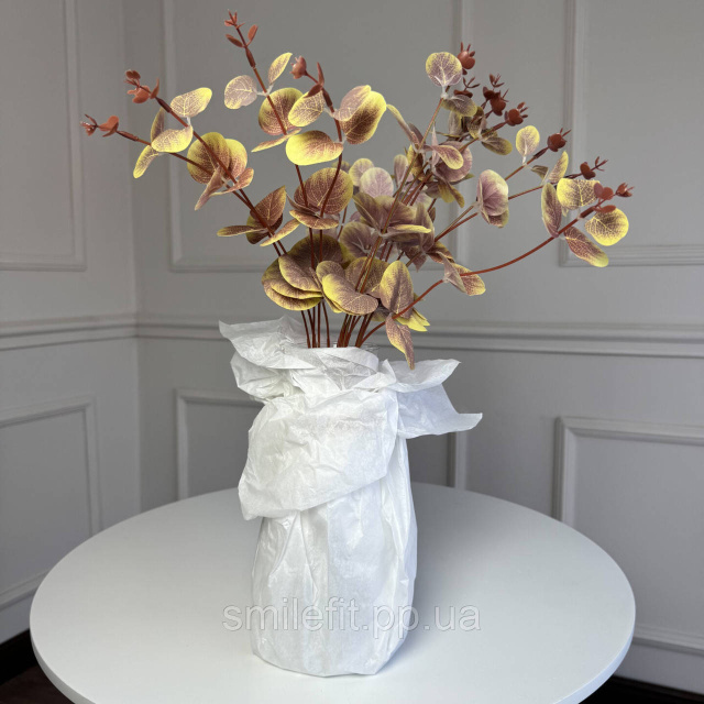 Штучний букет евкаліпту виконаний у природній декоративній стилістиці з напівпрозорим листям та виразною текстурою жилок. Округлі листки різного...
