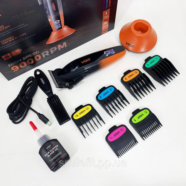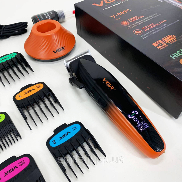 Акумуляторна машинка для стрижки VGR V-889C— професійний прилад з потужним мотором 9000 RPM, керамічними та MIM-лезами та часом автономної роботи до 250 хвилин. LED-дисплей показує оберти, заряд та стан роботи. Регулятор довжини 0.8-2 мм без насадок дозволяє виконувати фейди і точну окантовку. У комплект входять 6 насадок від 1,5 до 13 мм. Стильний дизайн, висока потужність та великий акумулятор роблять модель ідеальною як для барберів, так і домашнього використання.