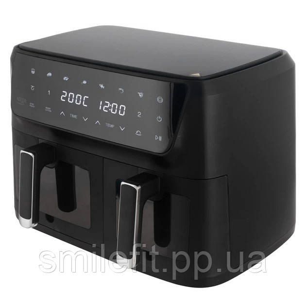 Аерофритюрниця Adler — сучасний кухонний прилад з подвійною конструкцією, що дозволяє готувати дві різні страви одночасно. Загальний об’єм 11 літрів (6,5 л + 4,5 л) ідеально підходить для сім’ї, а незалежні кошики дають можливість окремо налаштовувати час та температуру приготування.