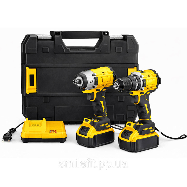 У набір входять два акумулятори, що дозволяють працювати без перерв, а також зарядний пристрій для швидкого підзаряджання. Всі компоненти зручно упаковані в міцний пластиковий кейс, який захистить інструменти від пошкоджень та забезпечить їхню безпеку під час транспортування.