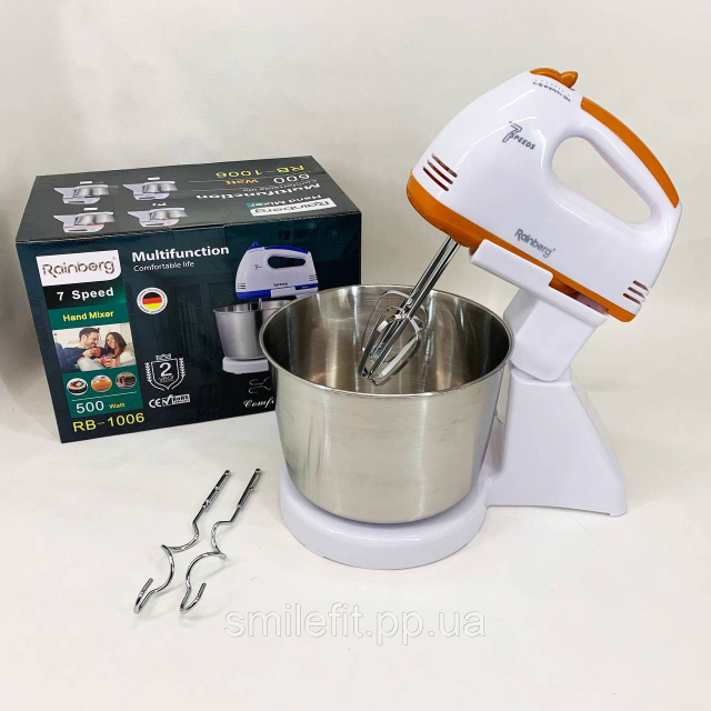 Завдяки 7 швидкісним режимам і високої потужності міксера Rainberg RB1006 , яка складає 500W, Ви з легкістю відтворите всі види тіста, від рідкого, повітряного, до щільного і міцного тіста. А два віночки для збивання дозволять швидко і якісно збити потрібний Вам продукт, будь то яєчні білки або повітряне суфле. Міксер Rainberg RB1006 — прилад дуже зручний та легкий у використанні та очищенні.