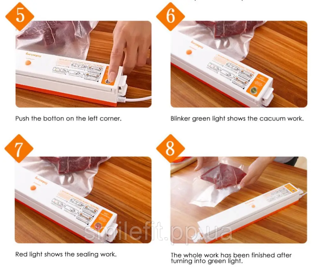 Закриваємо кришку, фіксуємо обидві клямки. Натискаємо кнопку включення, загориться червона лампочка. Пакувальник починає відкачувати повітря із пакета. Щойно лампочка змінить колір на зелений, процес упаковки завершено. Час вакуумації та заварювання шва визначається автоматично.