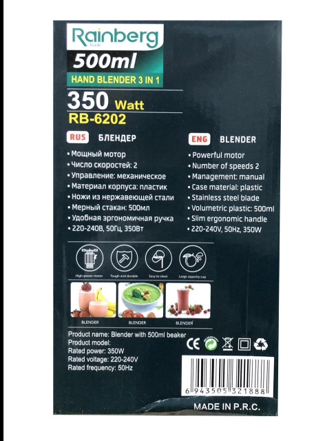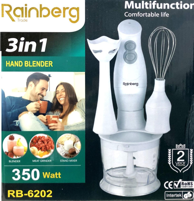 Блендер Rainberg RB 6202 3в1 – хороший надёжный, и что самое главное, вполне доступный, помощник на кухне для большинства современных хозяек. Ведь с его помощью можно приготовить, измельчить, перемешать до однородной массы много пищевых компонентов, начиная от детского питания и заканчивая изысканными, лёгкими и диетическими супами-пюре.