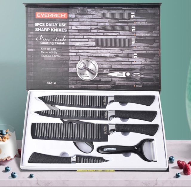 Набор ножей 6 в 1 с оригинальными лезвиями с V-насечкой с ножницами и овощечисткой из 6 предметов. Шикарный подарок хозяек и поваров. Вы не захотите с ними расставаться на кухне. Очень удобная рукоятка, она сливается с ладонью, а острота лезвий – восхитительна.