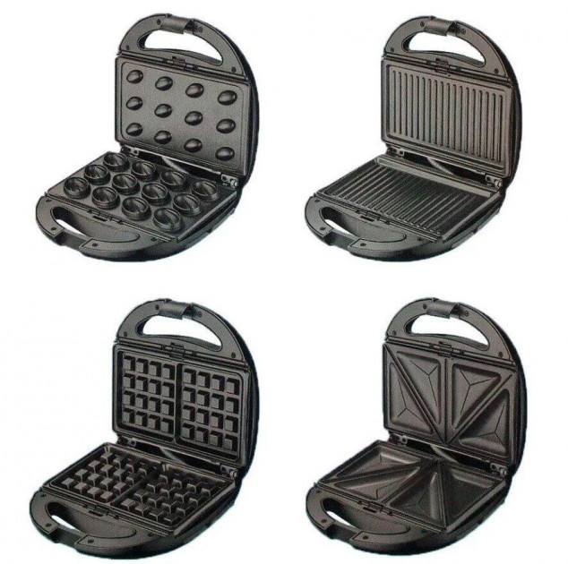 Универсальный прибор с четырьмя сменными насадками с антипригарным керамическим покрытием, сэкономит место на Вашей кухне и сделает приготовление всевозможных блюд быстрым и простым. Четыре насадки: 1. Гриль контактный (прижимной). 2. Орешница (как советские). 3. Бутербродница (сэндвичница, тостер треугольнички). 4. Вафельница (толстые бельгийские вафли, они же венские, брюссельские, гофре). Выпечка происходит быстро, т.к. 750 Вт вполне достаточно для домашнего приготовления. Для каждого блюда отдельные съемные формы, что удобно при чистке вафельницы Гриль имеет световую индикацию работы, означающие готовности к выпеканию или поджариванию. С каждой стороны прибора размещены нагревательные элементы в виде пластин, которые соприкасаются с приготовляемыми продуктами сверху и снизу - это обеспечивает быстрое и равномерное приготовление. Нет необходимости переворачивать продукты как в сковороде.