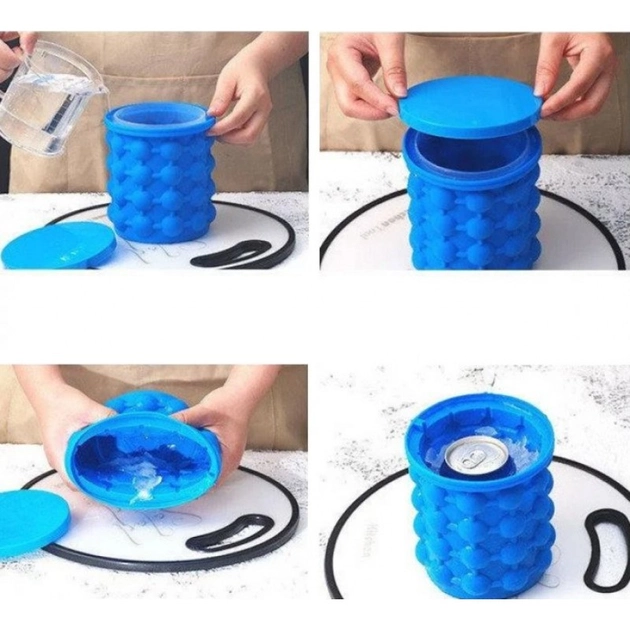 Форма ведро для льда Ice cube maker genie для охлаждения напитков в бутылках – лед нужен не только летом, но и для приготовления охлаждённых напитков и десертов на протяжении круглого года. Как же классно иметь в морозилке кубики льда в свободном доступе. Ведь не знаешь, когда понадобится такой ингредиент. Лед же нужен не только для коктейлей на основе газированных напитков или соков, но также для молочных коктейлей и различных видах мороженого. Красивые кубики льда подают к алкогольным крепким напиткам, например, виски.