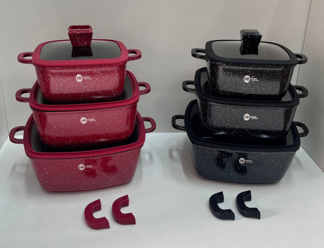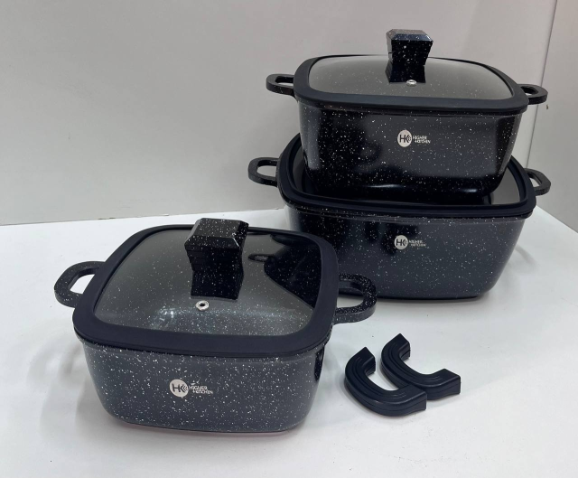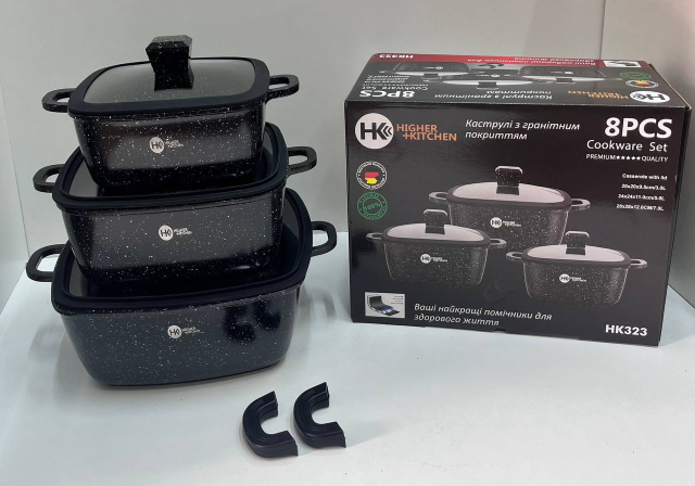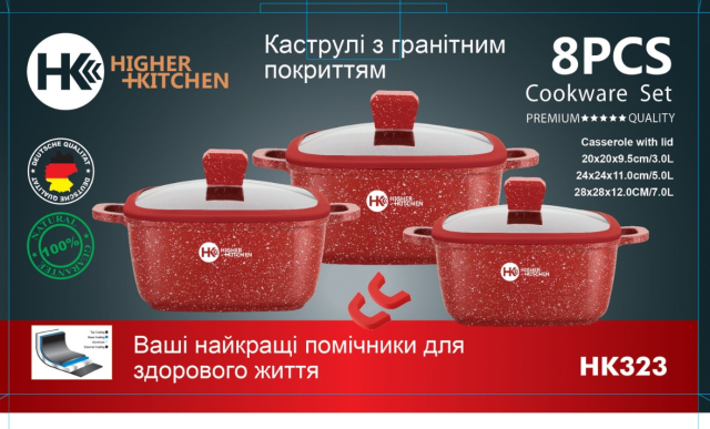 Набор из кастрюль с антипригарным покрытием из гранита. Посуда имеет индукционное дно, что делает их современными. В комплект входит 3 гранитных казана с крышками, также в комплекте 2 накладки для ручек. 3-хслойное антипригарное покрытие не влияет на вкус и запах пищи и предотвращает пригорание. Этот кухонный набор не содержит вредных веществ в своём составе и позволяет готовить пищу с минимальным количеством масла. Идеально для приготовления низкокалорийной, диетической еды. Уникальное индукционное дно TURBO INDUCTION экономит 35% энергии, обеспечивая равномерное распределение тепла по всей площади посуды. Набор посуды Higher Kitchen подходит для всех видов плит: газовых, электрических, индукционных, галогенных и стеклокерамических. Можно мыть в посудомоечной машине, готовить в духовке.