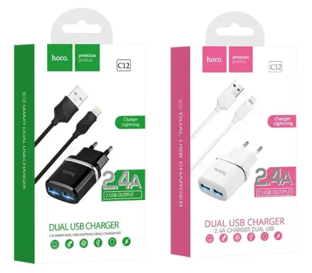 СЗУ адаптер 220V HOCO C12 2USB Smart Smart + кабель iPhone 2.4A