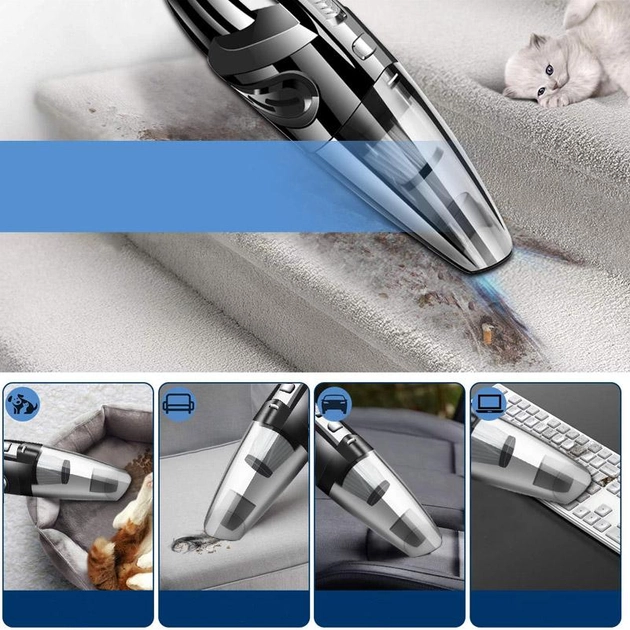 Беспроводной портативный автомобильный пылесос, которым можно убираться также дома или в офисе. Работает от литий-ионной батареи емкостью 2200 мАч.