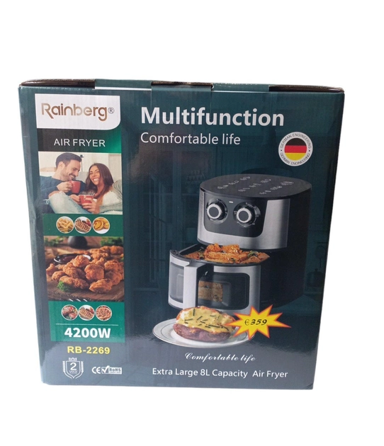 Это ваш надежный помощник на кухне, который делает приготовление еды быстрым, вкусным и полезным. С его мощностью 4200 Вт и вместительной чашей на 8 литров вы сможете готовить большие порции для всей семьи. С 10 предустановленными программами для различных блюд, регулировкой температуры от 80°C до 200°C и функцией таймера до 60 минут у вас будет полный контроль над процессом приготовления. Механическое управление делает использование аэрогриля Rainberg RB-2269 удобным и простым.
