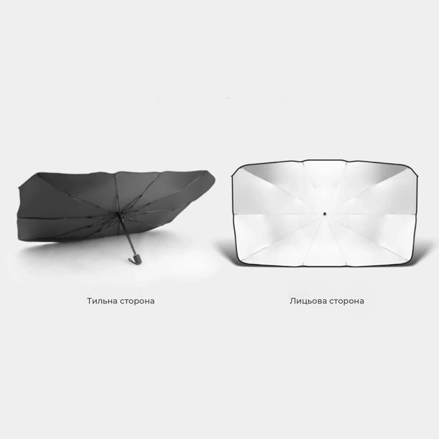Внутренняя часть зонта - черная, что затемняет салон при его использовании, внешняя - серебристая - способствует отражению солнечных лучей, тем самым значительно снижая температуру воздуха в салоне.