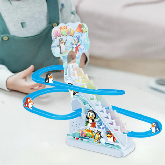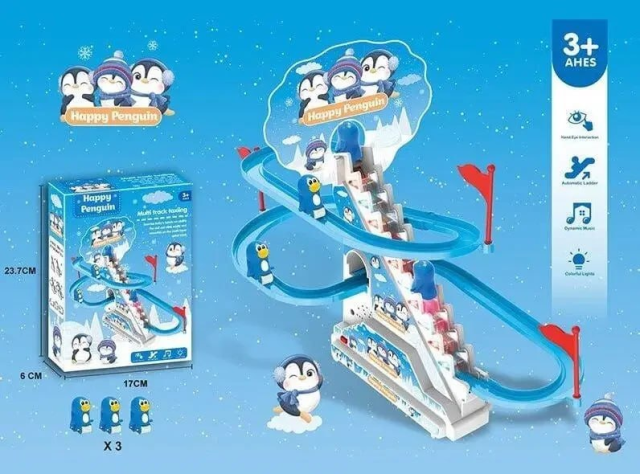 Трек Пінгвіни на гірці Happy Penguin приносить радість та веселощі до дитячої кімнати відразу ж. З його електронними сходами та крутими гірками, діти будуть у захваті від карабкань смішних звірків по заплутаним стежкам.