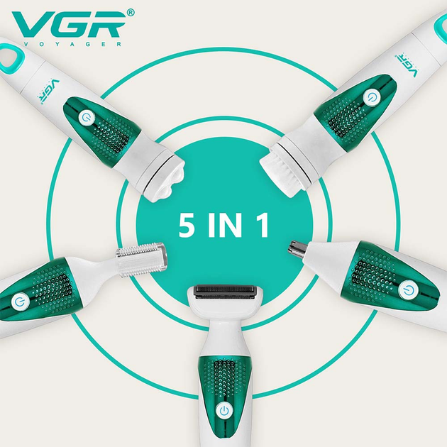 Эпилятор женский для удаления волос на теле 5в1 VGR V-720 - представляет собой многофункциональный инструмент, созданный для обеспечения полного ухода за вашим внешним видом. С этой электробритвой вы можете легко и эффективно провести несколько процедур, обеспечивая оптимальные результаты. VGR V-720 обеспечивает пять различных функций в одном устройстве. Она включает в себя электробритву, триммер для бороды, триммер для волос в носу и ушах, триммер для контуров, а также триммер для укладки волос.