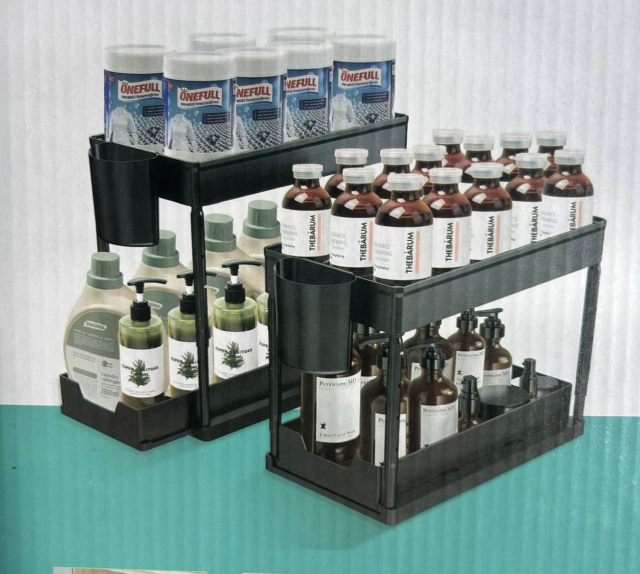 Благодаря двухуровневой конструкции эта полка оптимально использует пространство под раковиной, позволяя поддерживать порядок и удобный доступ к хранящимся вещам.