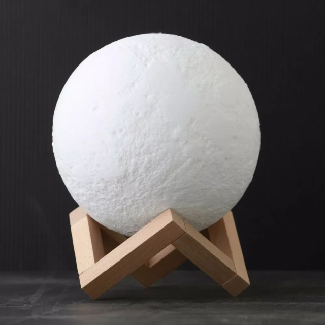 Лампа изготовлена с помощью инновационной технологии 3D-печати. Текстура корпуса имитирует реальный внешний вид луны со всеми неровностями и кратерами и смотрится очень красиво. Мягкий свет равномерно и плавно рассеивается по комнате, дает ощущение уюта и тепла. Более того с ним легче уснуть чем в полной темноте. Такой ночник станет идеальным дополнением к интерьеру не только спальни взрослых, но и в детской. И самые маленькие смогут спокойно засыпать под его светом.