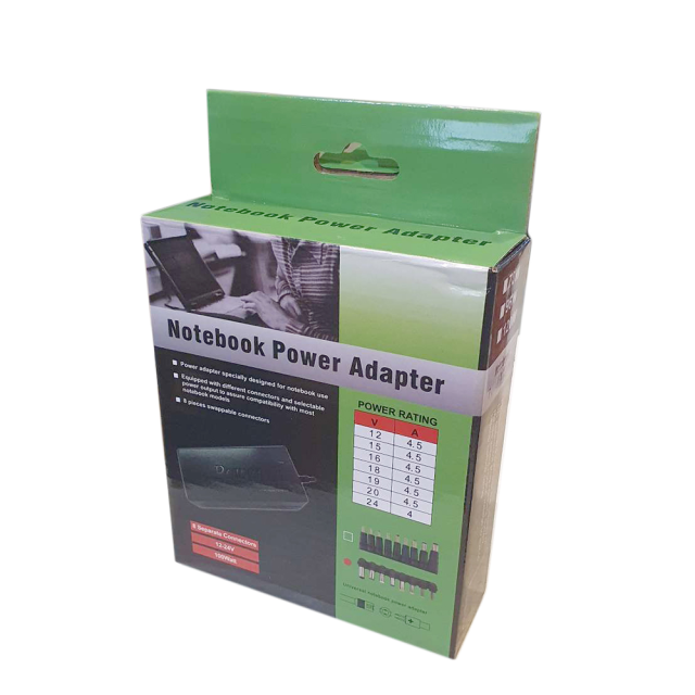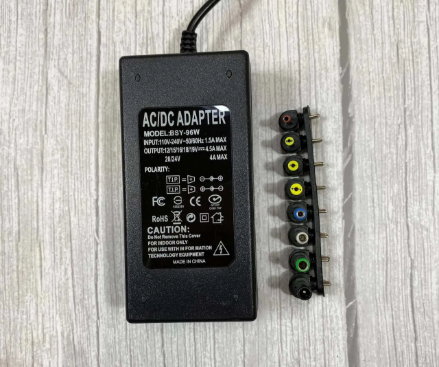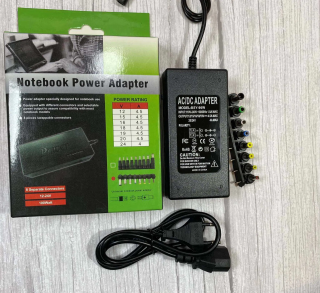 Адаптер для ноутбуков для ноутбуков 100 В BSY-96W поставляется вместе со специальным шнуром питания. Напряжение переключается при помощи бегунка, располагающегося на боковой части адаптера. Каждое последующее переключение будет отображаться на линейке зеленных светодиодов, напротив которых находится надпись с выходным напряжением. Вам всего-навсего потребуется подобрать нужную насадку, которая подойдёт под разъем имеющегося устройства.