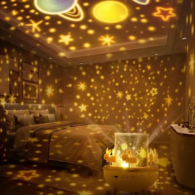 Вбудована Bluetooth-колонка дозволяє відтворювати улюблену музику або казки, забезпечуючи якісний звук. При закритому ковпаку пристрій працює як нічник з м'яким світлом, а при знятті ковпака – як проектор, проеціюючи зображення на стіни та стелю. Також доступна функція обертання для більш живого та чарівного ефекту.