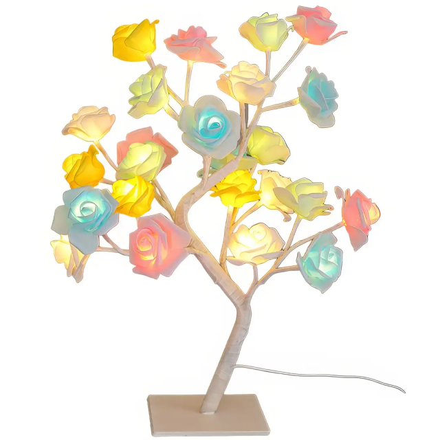 Настільна лампа Дерево Кольорова Троянда це елегантне та затишне рішення для створення святкового та атмосферного освітлення. Світильник із штучним деревом прикрашений 24 світлодіодами у вигляді квітів троянд, що випускають тепле біле світло.