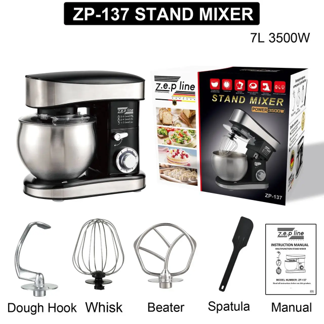 Zepline ZP-137 – це багатофункціональний кухонний міксер, який чудово підходить для замішування тіста, збивання крему та інших кулінарних завдань. Потужний мідний двигун 3500 Вт гарантує ефективну роботу, а 7-літрова чаша з нержавіючої сталі дозволяє готувати великі порції.