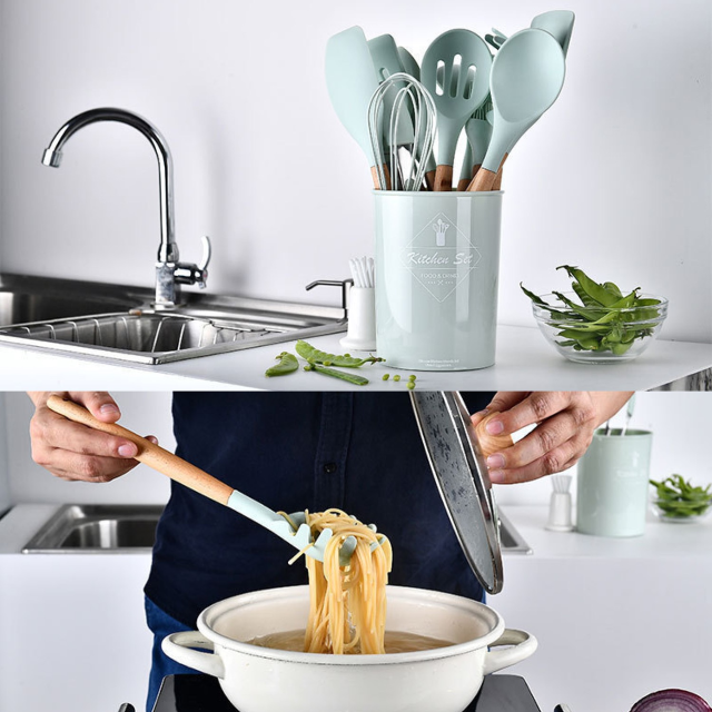 Кухонний набір Kitchen Set стане яскравим аксесуаром на вашій кухні. Завдяки жароміцному силікону, кухонне приладдя можна використовувати для посуду з антипригарним покриттям