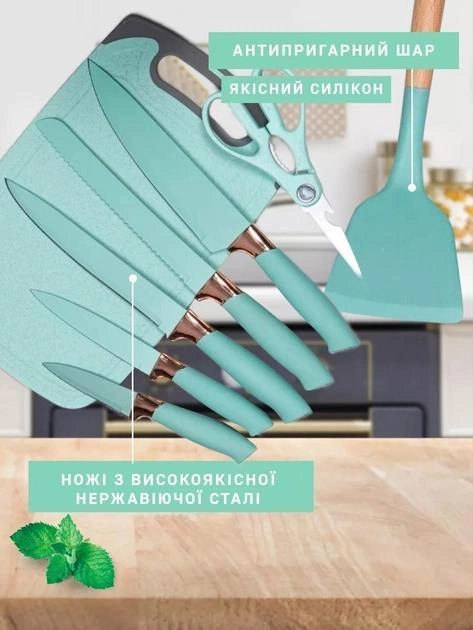11 силіконових кухарів, здатних витримувати температуру до 230 градусів, із зручною ручкою з бамбука. Крім того, представлений повний комплект ножів: