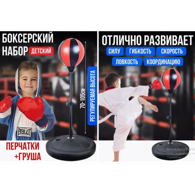 Боксерська груша — пошита з міцного шкірозамінника двох кольорів (червоного і чорного), має діаметр 20 см, що дозволяє відмінно тренувати реакцію юного спорстмена; має змінну висоту від 90 до 110 см, завдяки чому можна швидко і легко підлаштувати снаряд під зростання дитини;