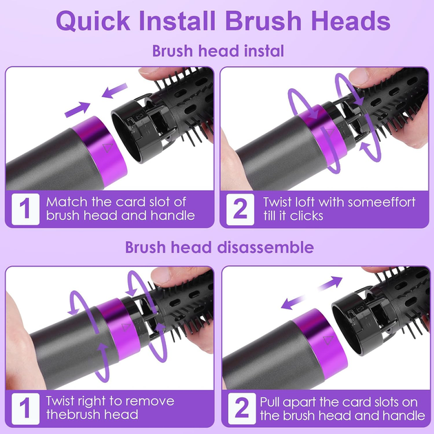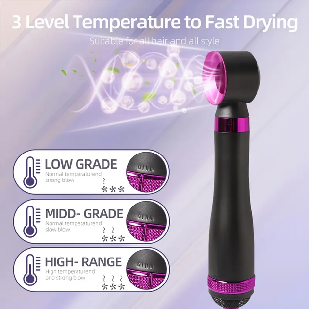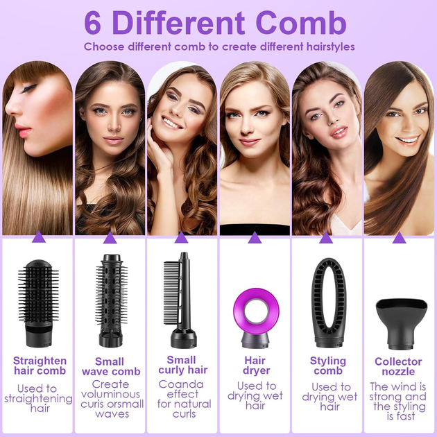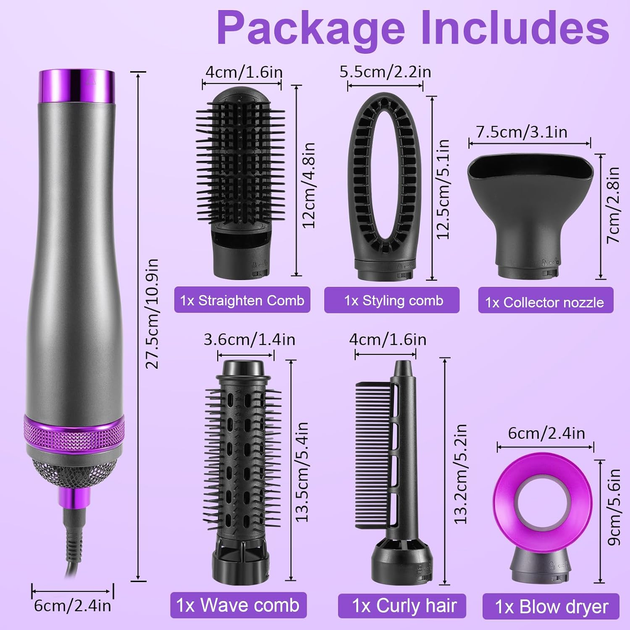 6 знімних насадок: фен, брашинг для об'єму, щітка для завивки та випрямлення.