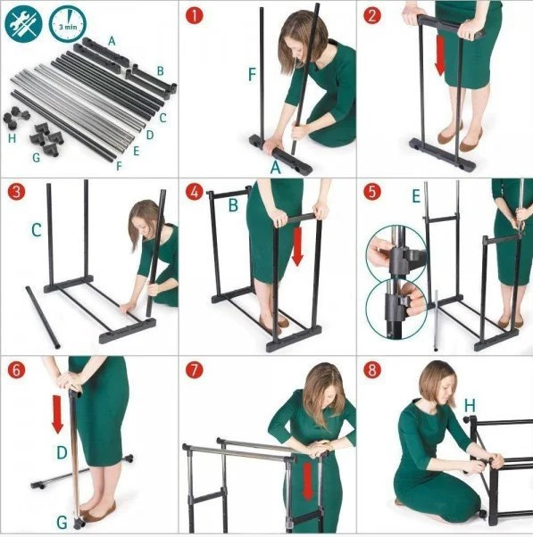 Так як стійка для одягу Double Pole Clother Hose повністю збірна, і до того ж без єдиного болта, гвинта або шурупа, зібрати і розібрати її, при необхідності, не складе багато часу, в середньому на збірку піде не більше 20-30 хвилин (якщо не поспішати). Всі трубки стійки скріплюються за допомогою великих пластикових замків. Трубки стійки Double Pole Clother Hose виготовлені з алюмінію і покриті захисною фарбою оливкового кольору, порожнисті всередині, тому стійка навіть у збірці важитиме не більше 1,5 кг. Пластикові заглушки на кінцях труб, що випирають, зібраної конструкції, захистять одяг і запобігають випадковому падінню одягу якщо він буде просто накинутий на стійку. Великим плюсом стійки для одягу Double Pole Clother Hose є наявність невеликих коліс, завдяки яким