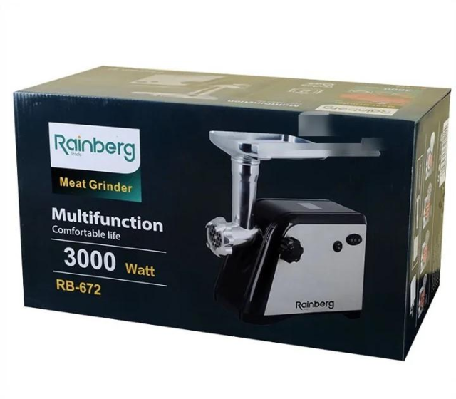 Електрична м’ясорубка Rainberg RB-672 зі збільшеною Потужністю 3000 Ватів здатна швидко перемолоти м’ясо, рибу, овочі, зробити будь-яку нарізку, профільування пісочного та пельменного тіста. А також приготує сік або морс для консервації.