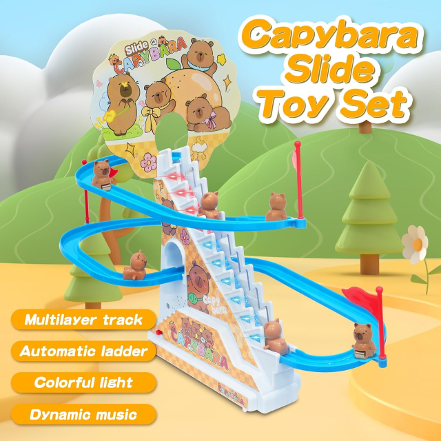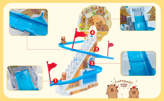 Маленька капібара, що піднімається сходами, виготовлена з високоякісного ABS-матеріалу. Продукт не постачається з батарейками. Відмінна стійкість до ударів .