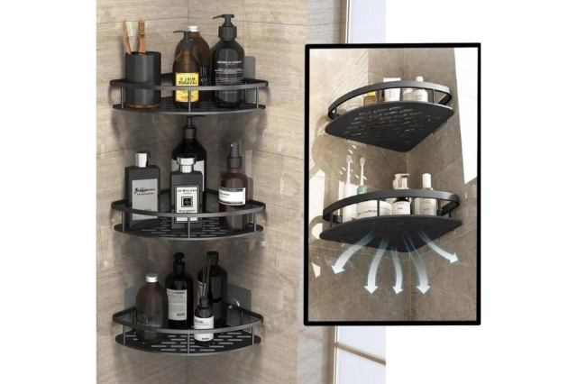 Полиця кутова для ванної підвісна металева самоклеюча універсальна чорна — це зручне і стильне рішення для організації простору у ванній кімнаті. Завдяки компактному кутовому дизайну вона ідеально підходить для зберігання косметичних засобів, засобів для ванни та інших дрібниць, що допомагає заощадити місце та зберегти порядок.