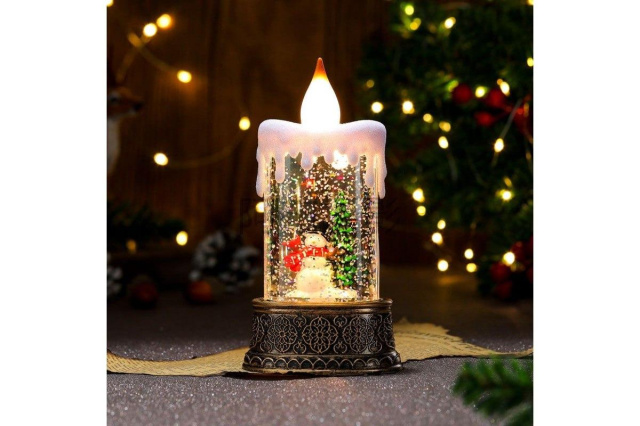 Створіть атмосферу зимової казки із оригінальним нічником у формі свічки. Усередині композиції оживає святкова сцена: ошатна ялинка, сніговик і весела дитина, оточені мерехтливими блискітками, які під світлодіодним підсвічуванням нагадують чарівний снігопад.